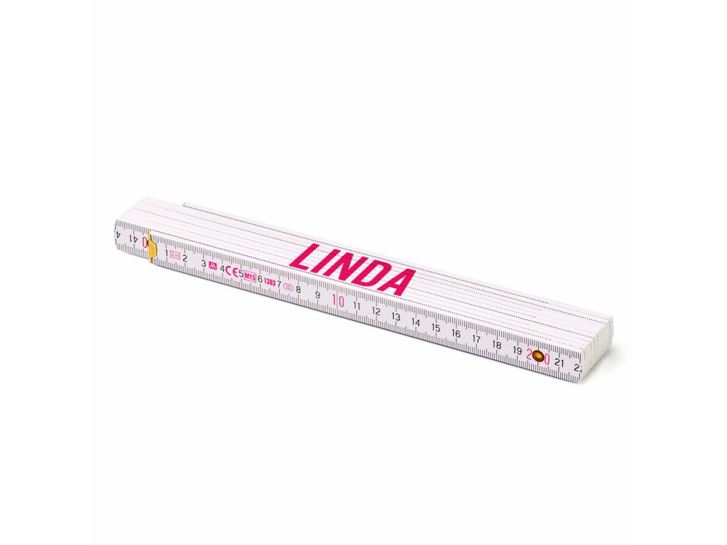 Skládací metr (2m) s potiskem Linda . Skládací dřevěný metr, typ Block 52.10 lamel – 2m, rozměr lamel: 3,2 mm x 16 mm, materiál: buk / habr, skryté ocelové klouby, viditelný nýtDoplňkové parametry