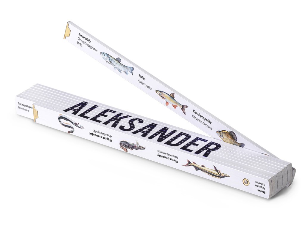 Rybářský skládací metr 2 m s barevně vytištěnými rybami je spolehlivé měřidlo a také výjimečný personalizovaný dárek se jménem Aleksander. Vyrobeno v Česku s certifikací, ideální pro každodenní použití u vody.