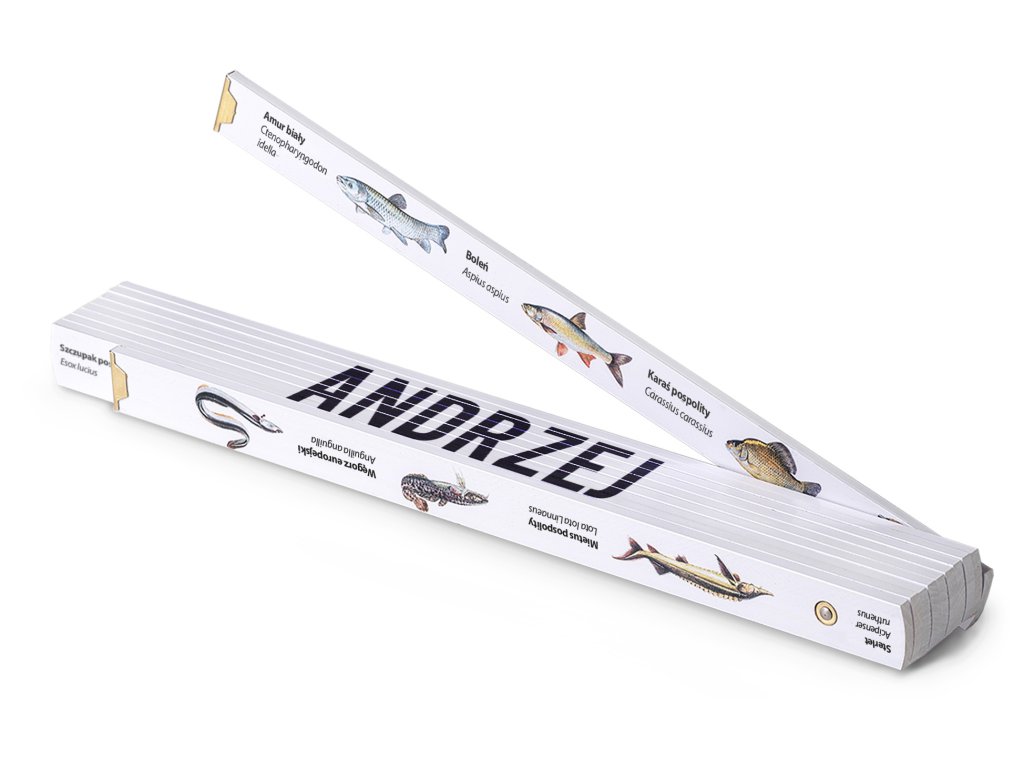 Rybářský skládací metr 2 m s realistickými obrázky sladkovodních ryb kombinuje přesné měření a osobní věnování se jménem Andrzej. Český certifikovaný produkt je praktický, ekologický a vhodný jako dárek pro každého rybáře.