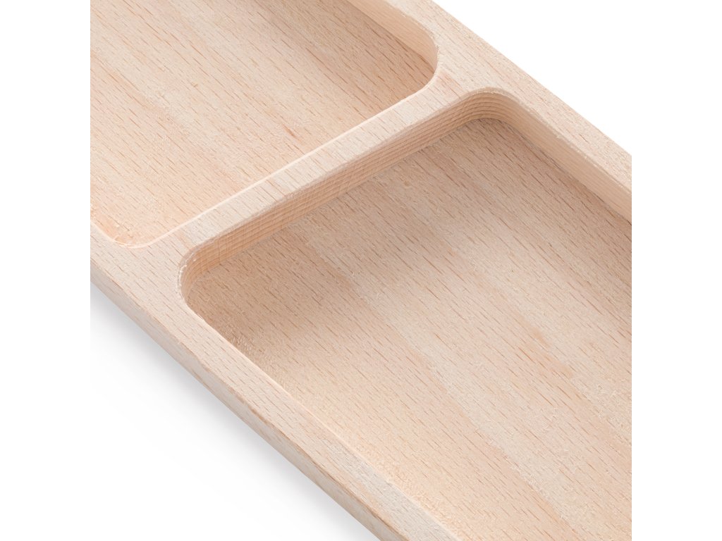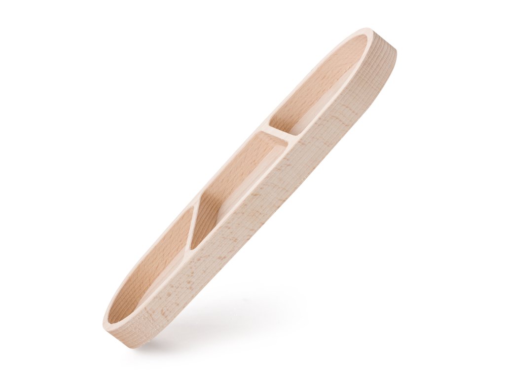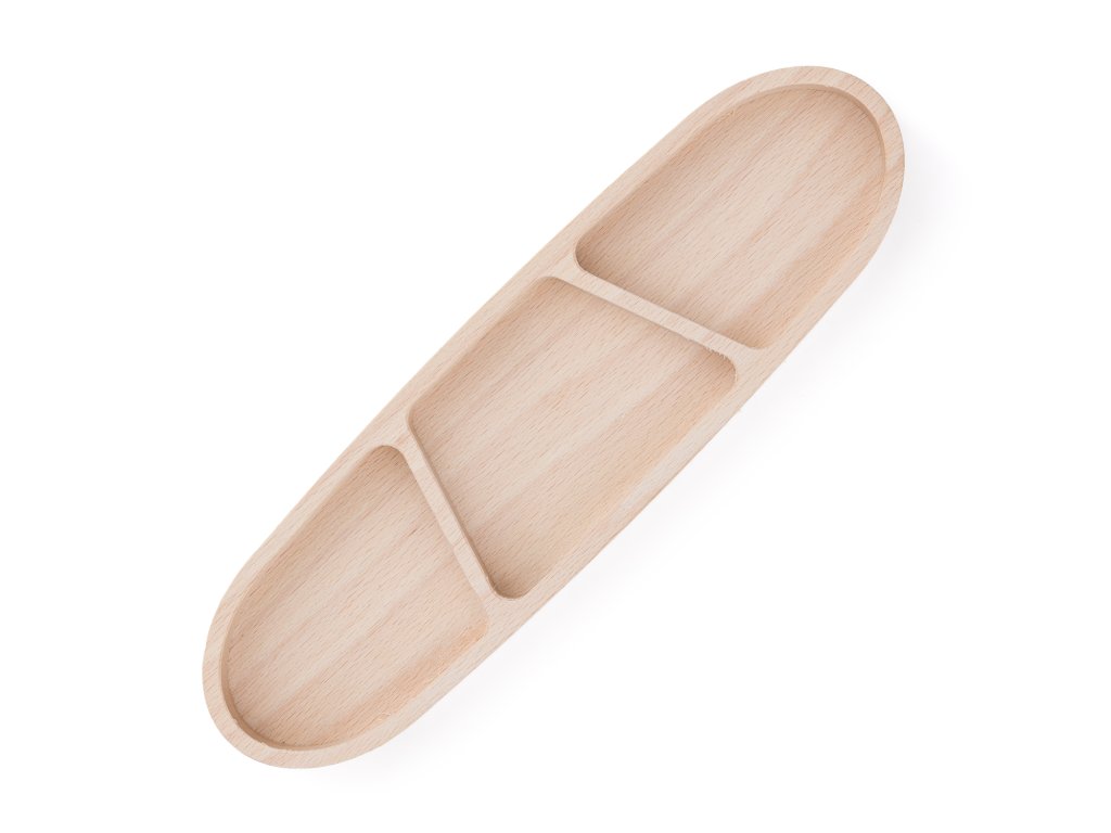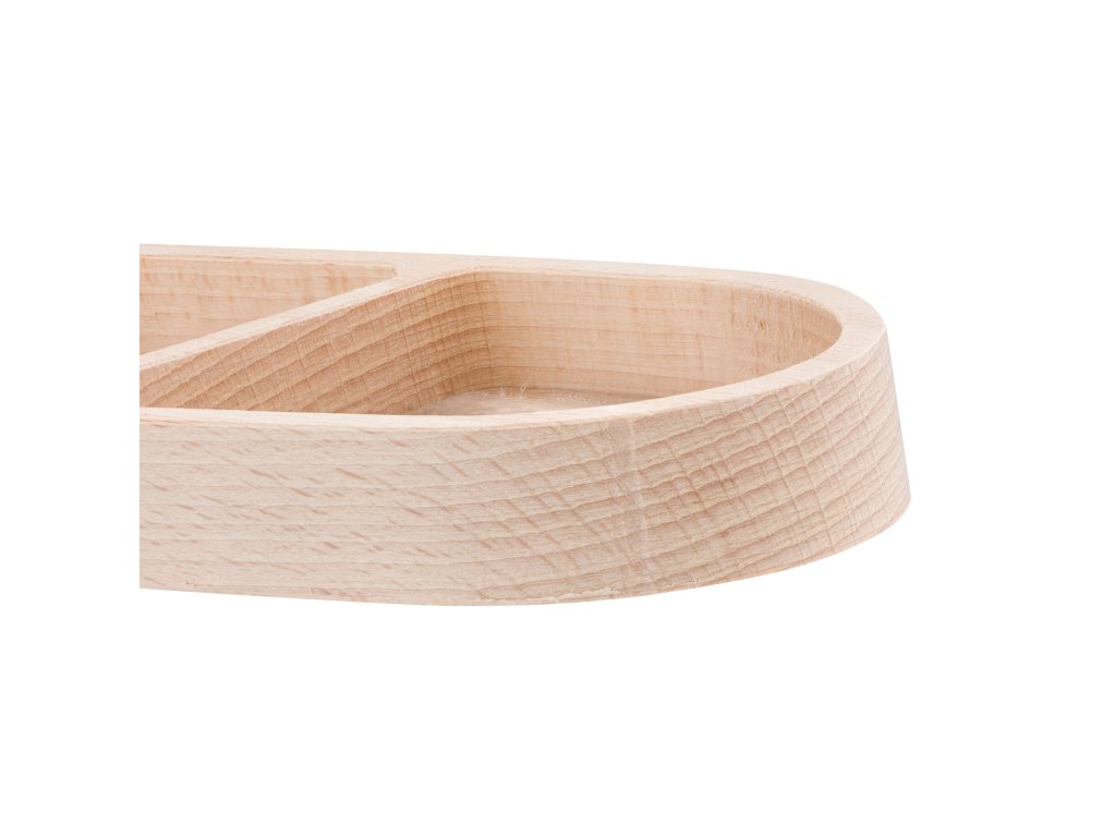 Oválná miska z bukového dřeva je rozdělena dvěma šikmo vedenými přepážkami do tří samostatných oddílů. Vhodná k přehlednému servírování různých druhů potravin, sušeného ovoce nebo drobných předmětů.