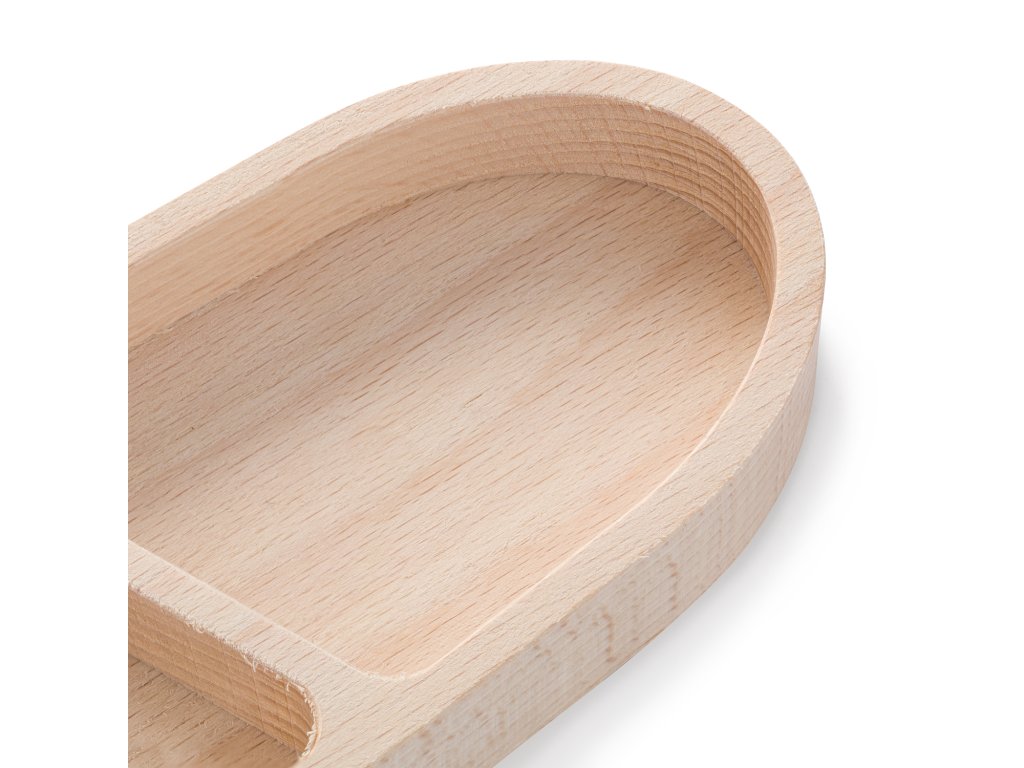 Vyrobena z masivního buku bez povrchové úpravy. Miska má měkce zaoblený tvar a diagonálně uspořádané přepážky, které vytvářejí uvnitř jemný rytmus a opticky prodlužují proporce.