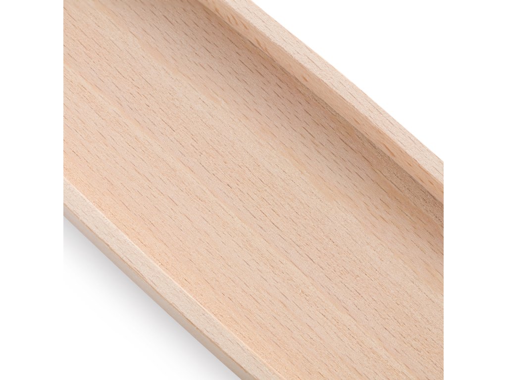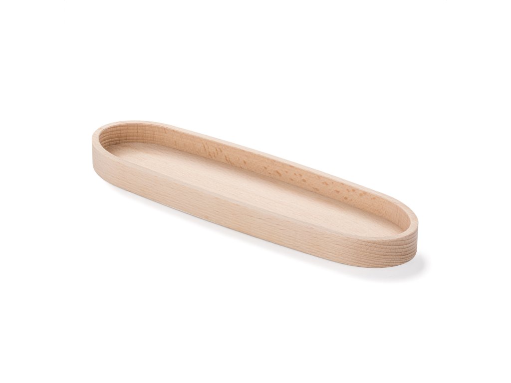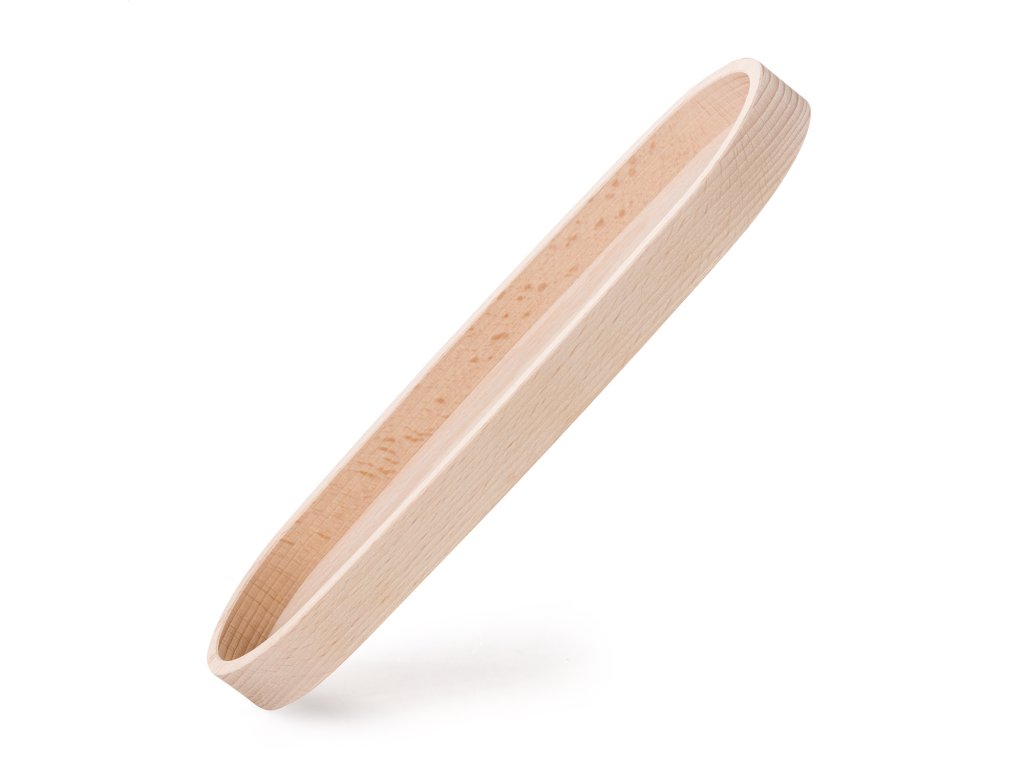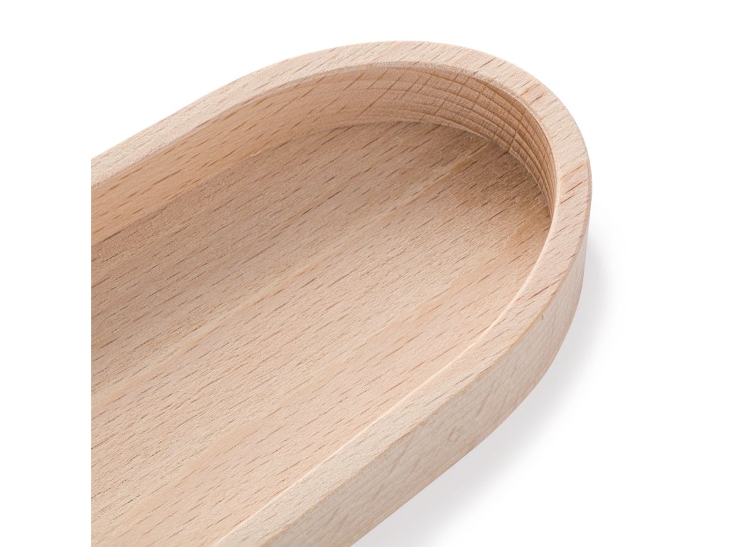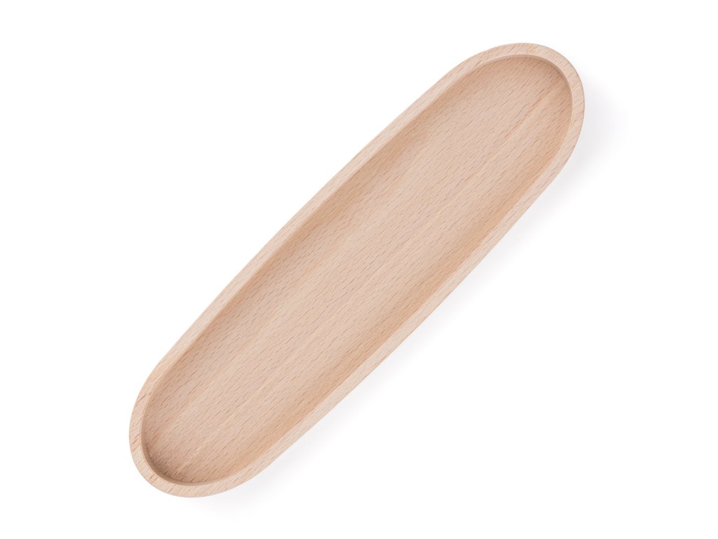 Podlouhlá oválná miska z bukového dřeva s čistým vnitřním prostorem bez přepážek. Vhodná pro servírování, prezentaci nebo ukládání předmětů různého druhu.