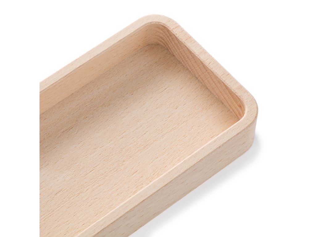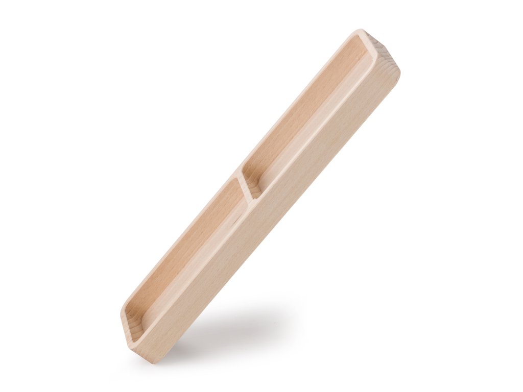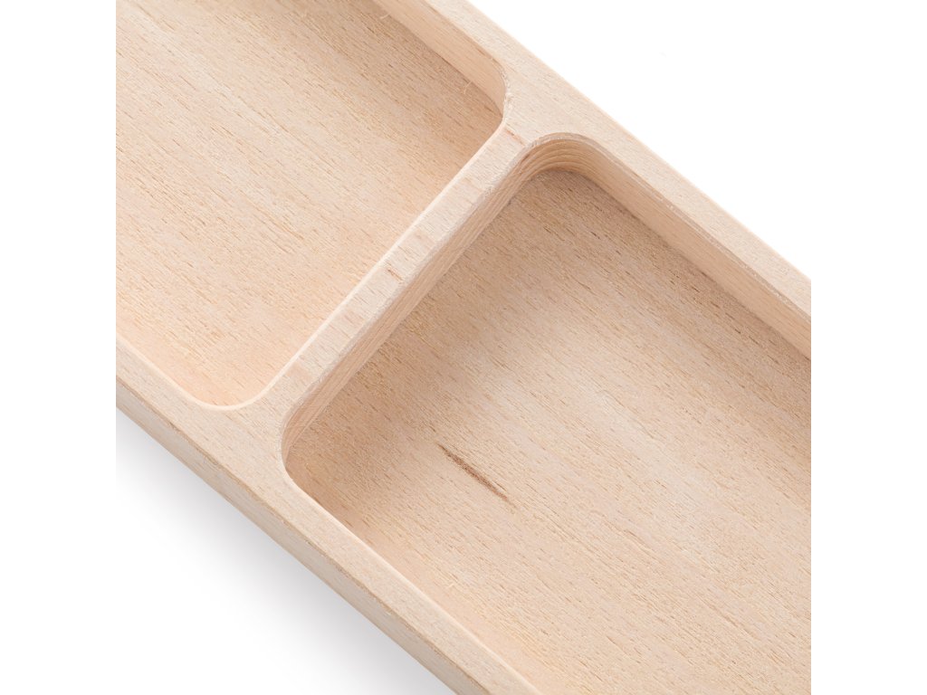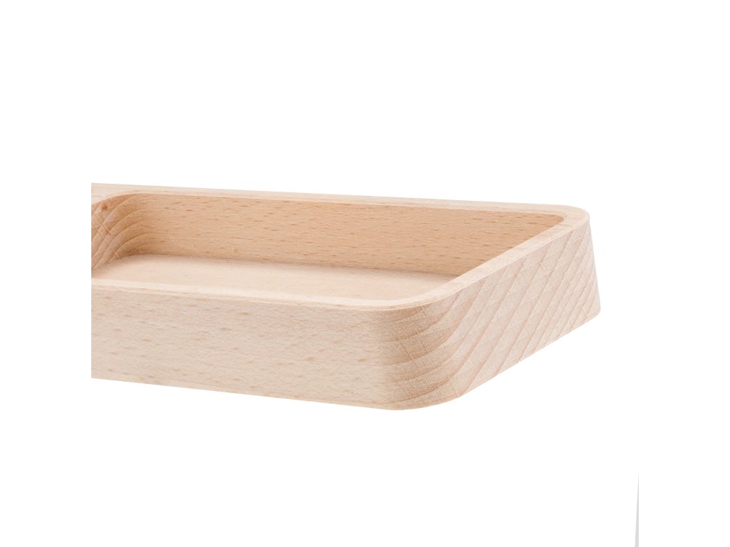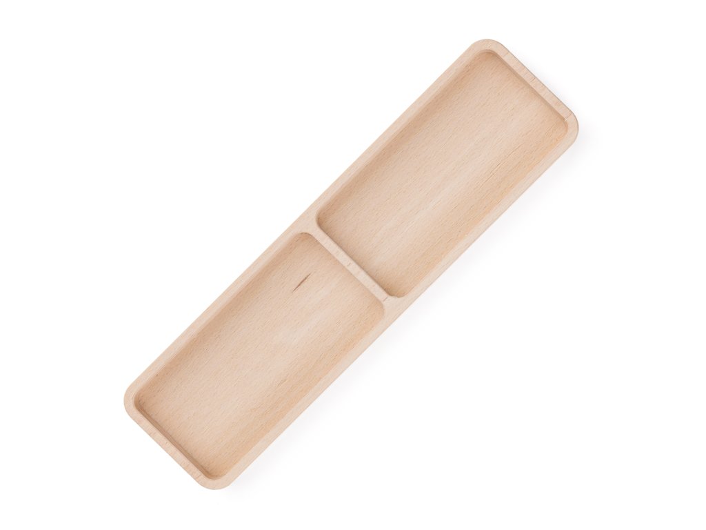Obdélníková dřevěná miska z bukového masivu s jednou kolmou přepážkou, která rozděluje prostor na dva rovnoměrné oddíly. Díky svému přehlednému členění je vhodná pro oddělené servírování, uložení surovin, předmětů i drobných dekorací v interiéru.