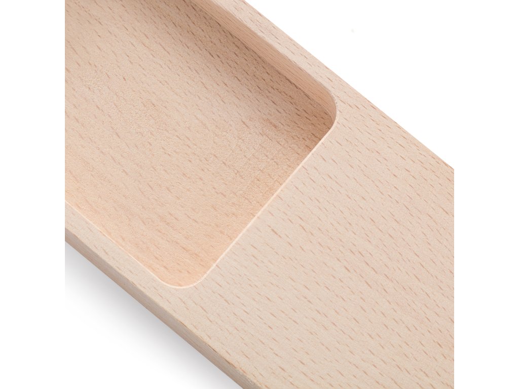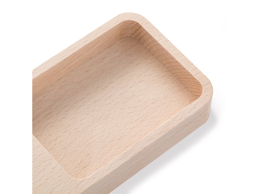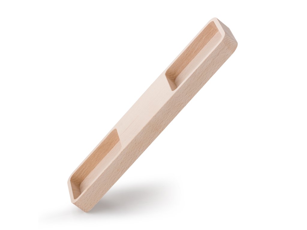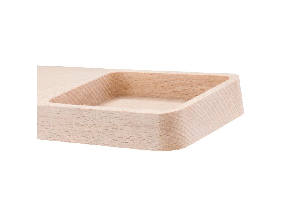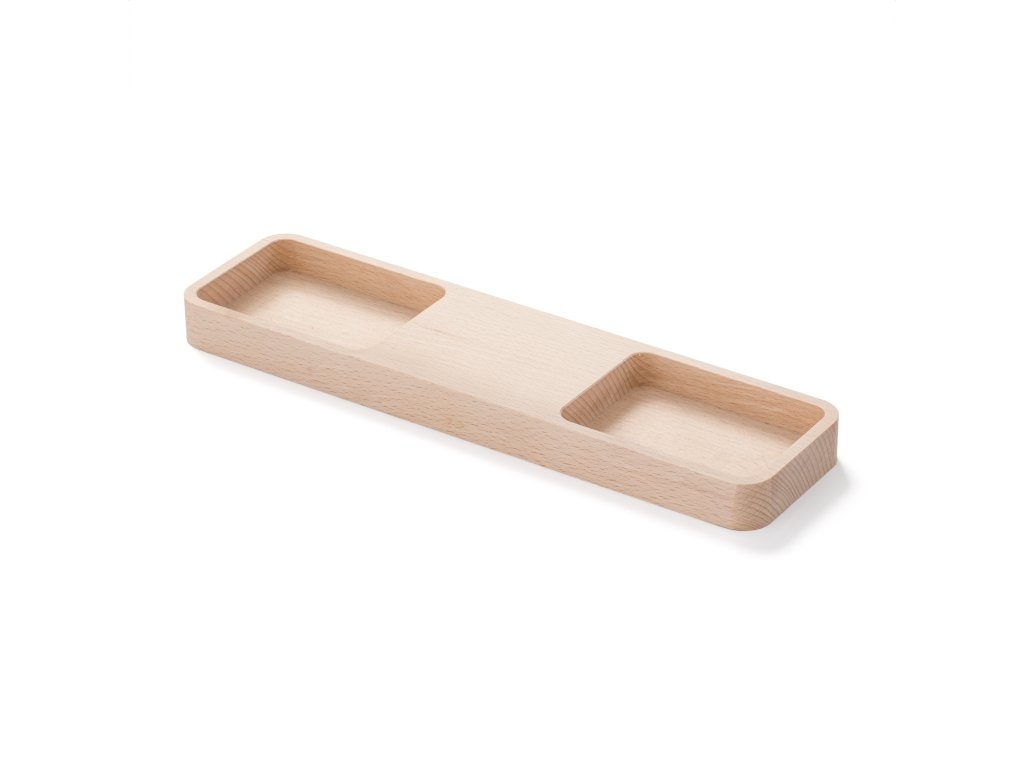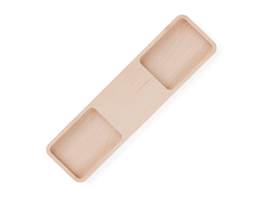 Obdélníková dřevěná miska z bukového masivu s dvěma vyfrézovanými oddíly po stranách. Mezi nimi je ponechána rovná plocha ve stejné úrovni jako horní hrana, která slouží k odkládání menších předmětů nebo jako vizuální členění celku.