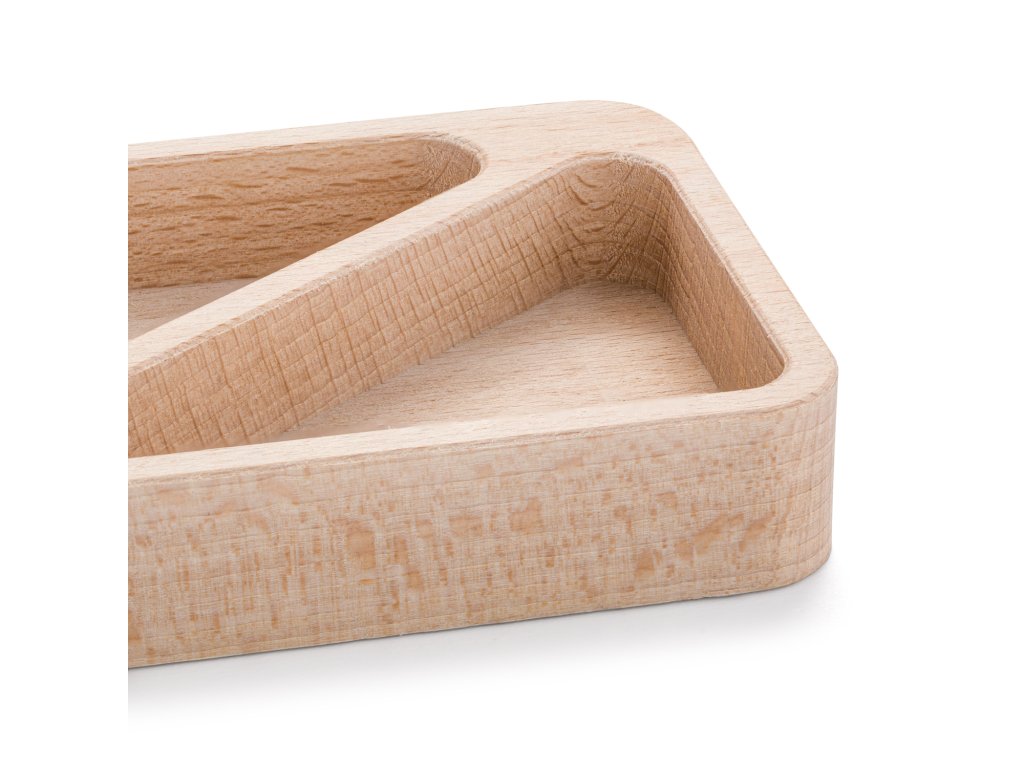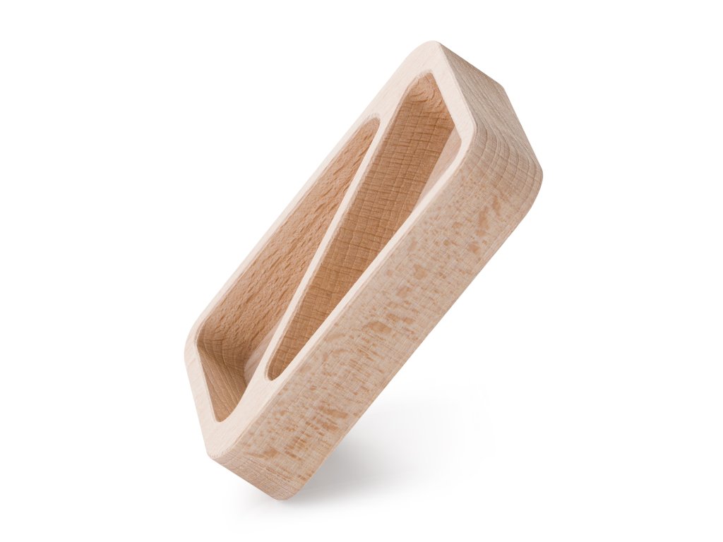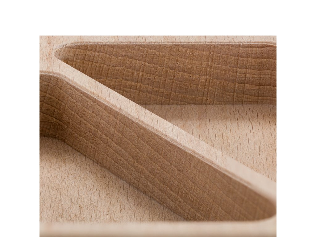 Celý výrobek je tvořen z jednoho bloku bukového dřeva o tloušťce 20 mm. Přepážka je přesně vyfrézována, bez přídavných spojů, čímž je zachována celistvost materiálu. Hladce opracovaný povrch nechává vyniknout přirozené kresbě dřeva a působí příjemně na dotek.